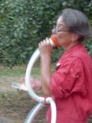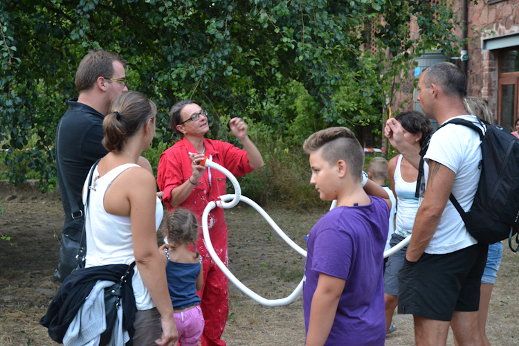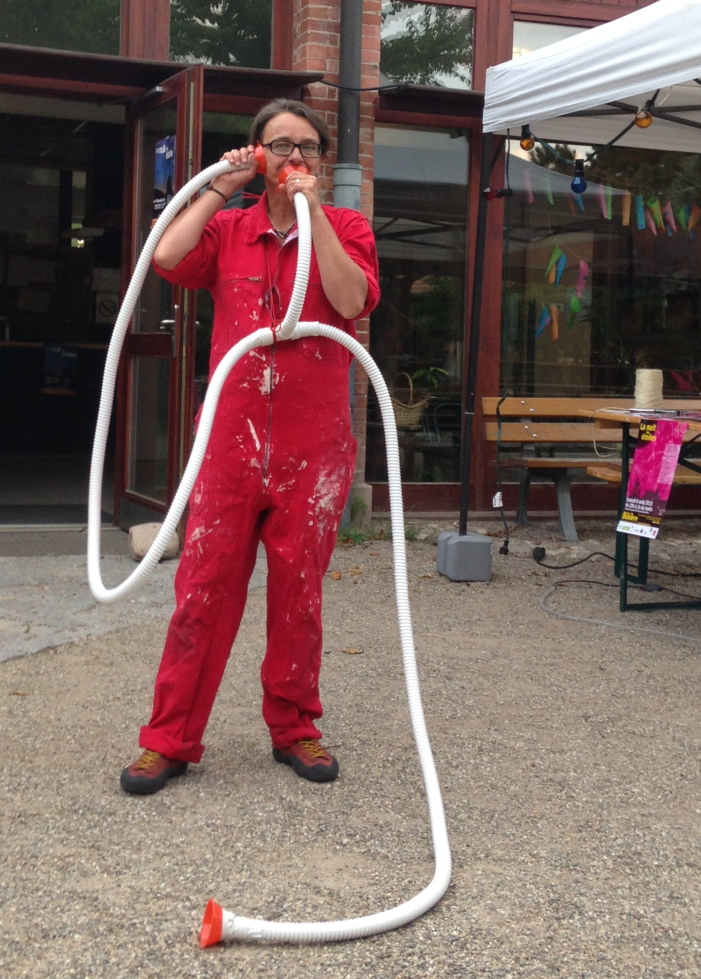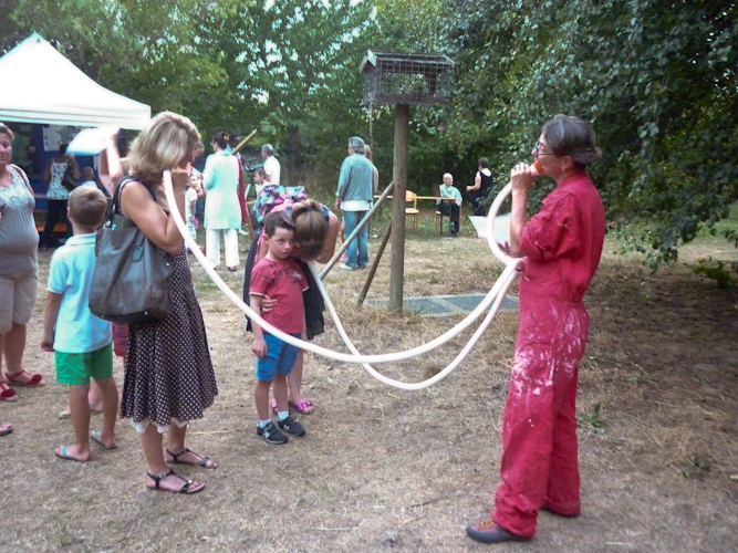 » j’ai décidé de me trimbaler avec un objet de mon invention : la machine à voyager la parole des étoiles. Un tuyau sonore avec écoutilles pour semer au vent des oreilles des petits ‘saviez vous que’. Pour transmettre, le tuyau comporte une entrée et plusieurs sorties, j’espère que les variations électromagnétiques ne seront pas trop intenses, rappelons que les vibrations entretenues dans une étoiles se font dans la matière de celle-ci. Elles sont observables par l’intermédiaire des variations lumineuses de l’étoile car le son n’est pas transmis dans le vide spatial. Nous écouterons donc ici non pas les enregistrements directs que je ramène de mon voyage… mais une reconstitution sonore des données d’observations, modélisée par un synthétiseur à étoile, à savoir la machine décrite précédemment. »